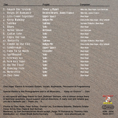 DION HOPE ist ein vielseitiger Musiker und Komponist. Unter seinen Aktivitäten als Fotograf und Videofilmer in vielen unterschiedlichen Gebieten gehört seine Arbeit als Gitarrist, Sänger, Keyboarder und Bandleader sowie als Sideman für verschiedene SängerInnen.
